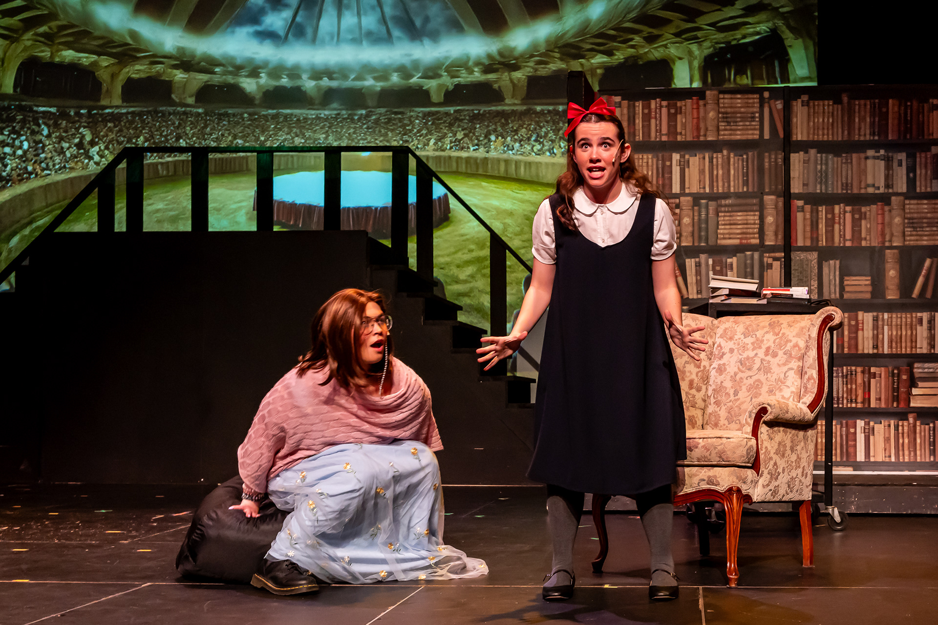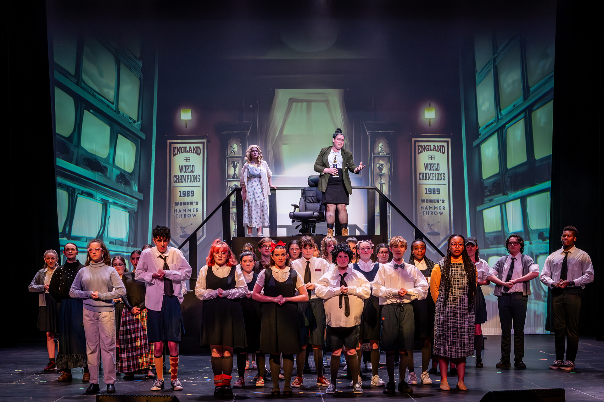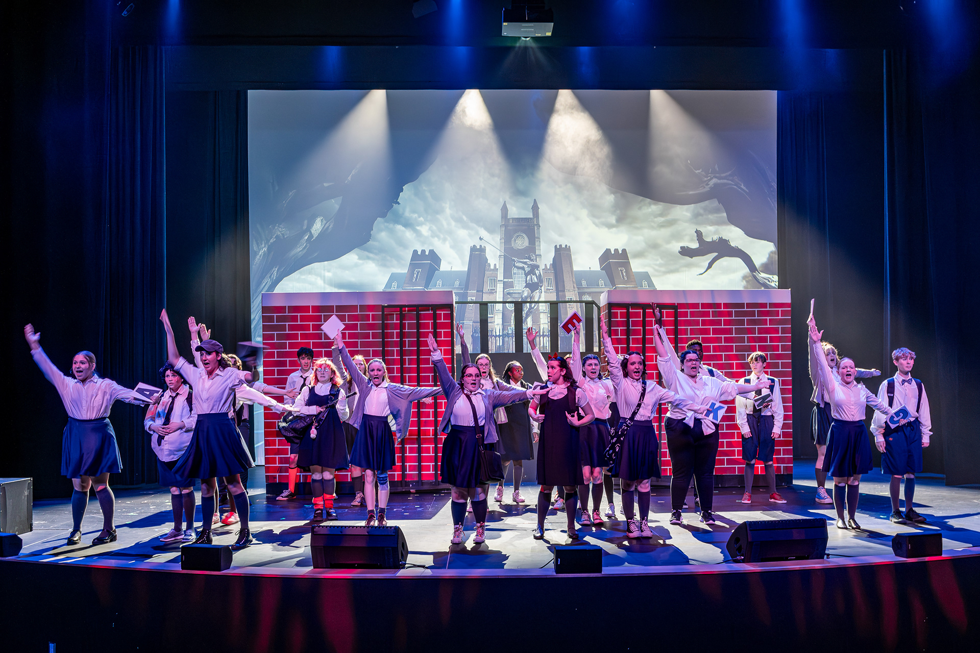 Theatre Ancaster’s youth division needed a full suite of projected visuals to support their staging of Matilda the Musical. The challenge was to create an engaging visual world that enhanced the narrative across a wide range of scenes — from quiet classroom moments to explosive musical numbers — while working within the technical limits of a youth theatre production.