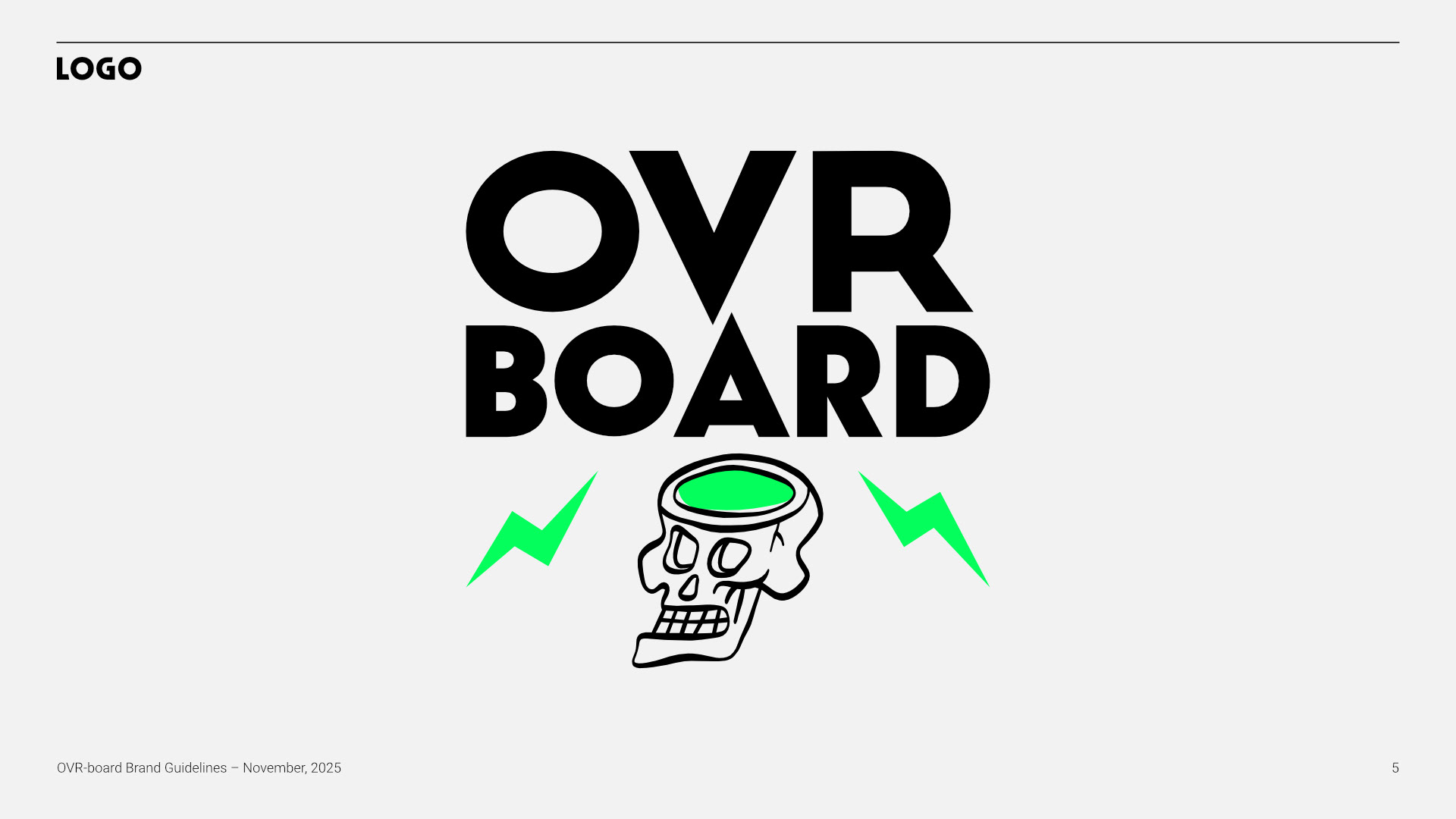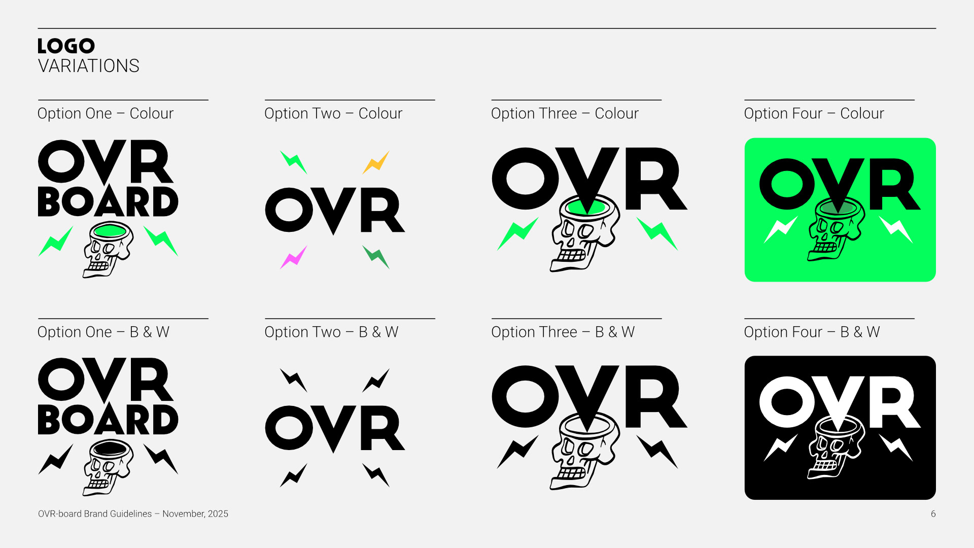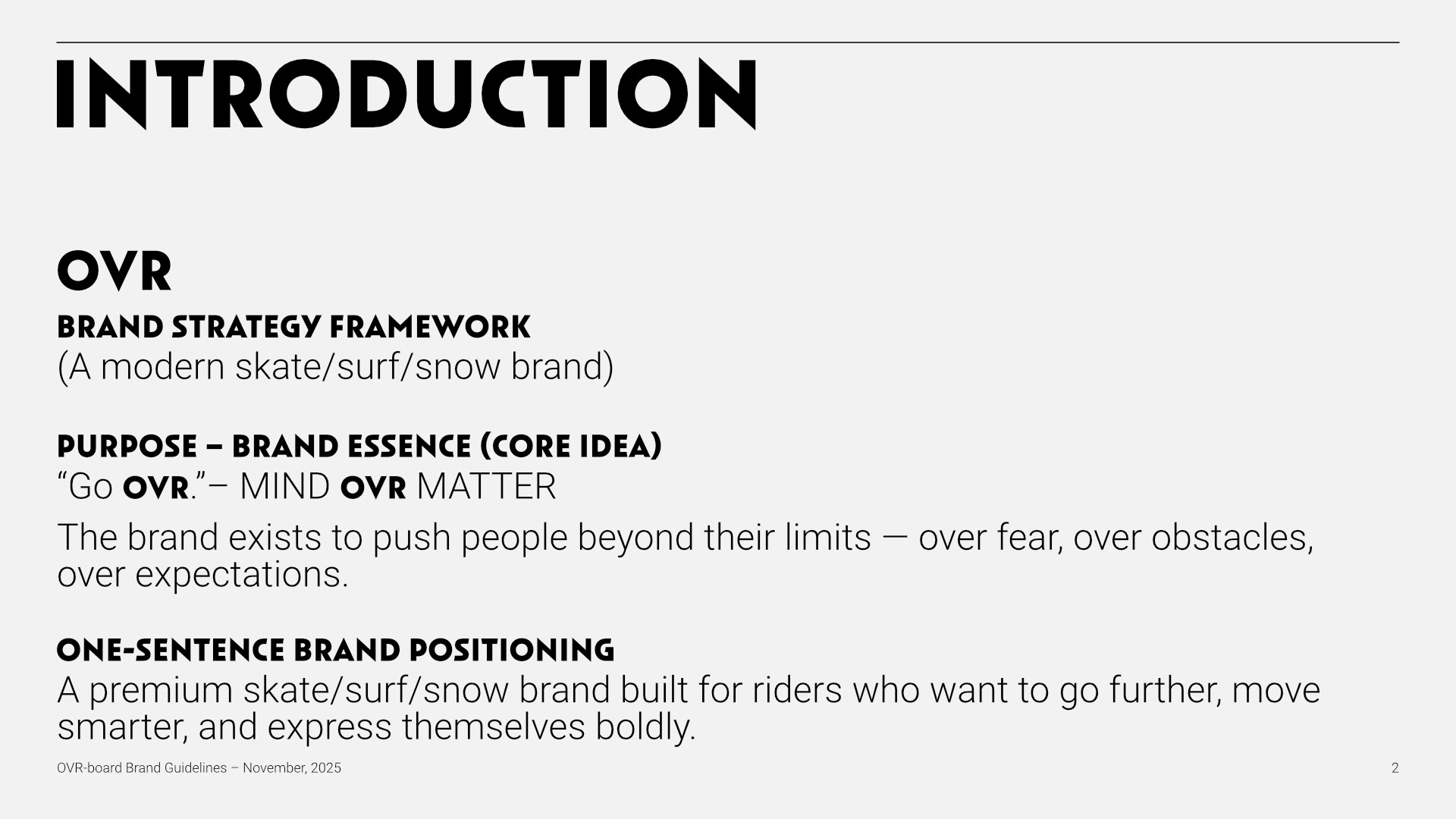 The final brand guidelines provide a strong strategic foundation for future growth, covering brand essence, personality, tone, and audience alignment. The system is adaptable across apparel, equipment, digital, and experiential touchpoints—positioning OVR-BOARD as a confident, design-driven brand ready to compete in the premium action-sports space.
