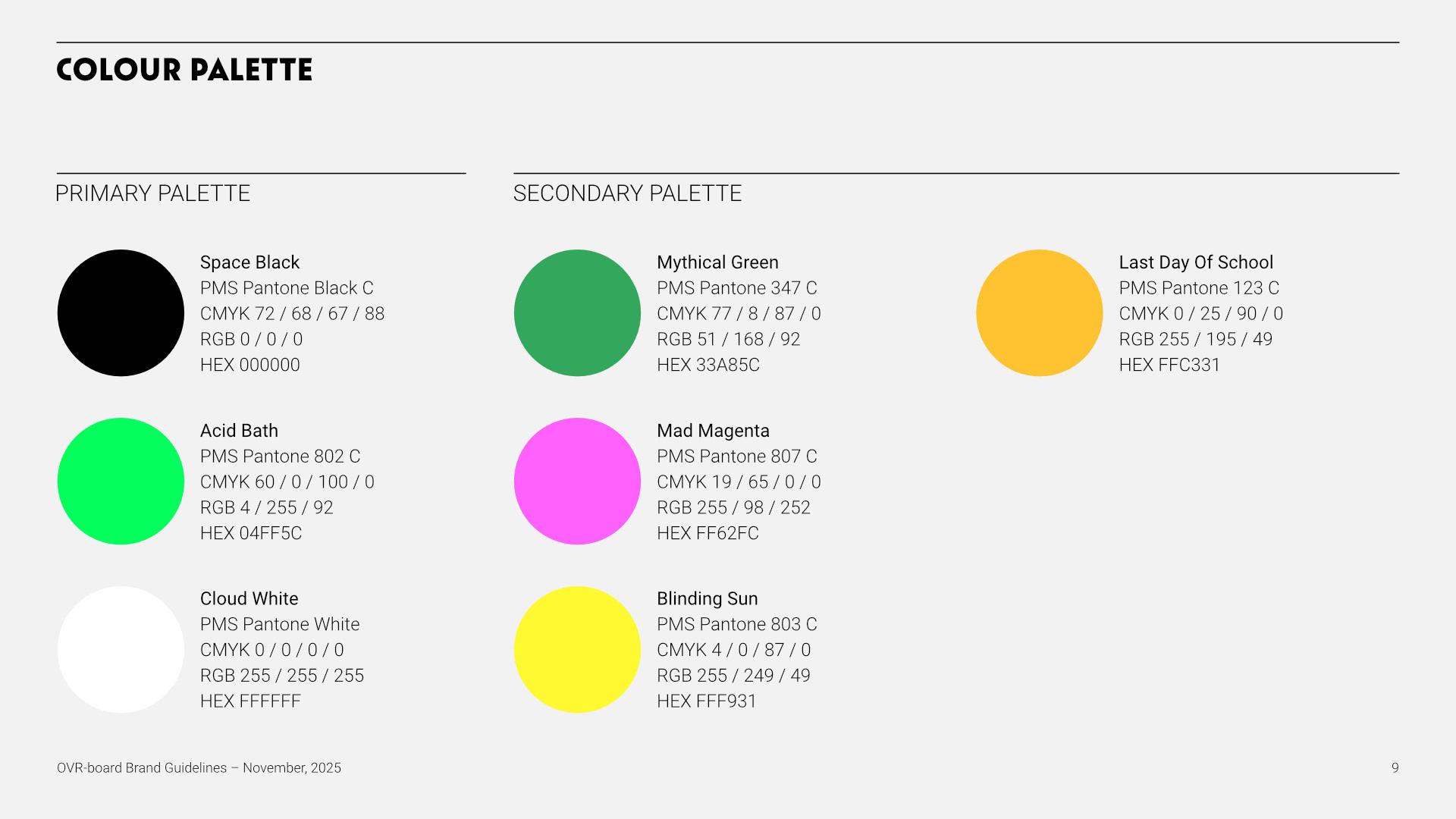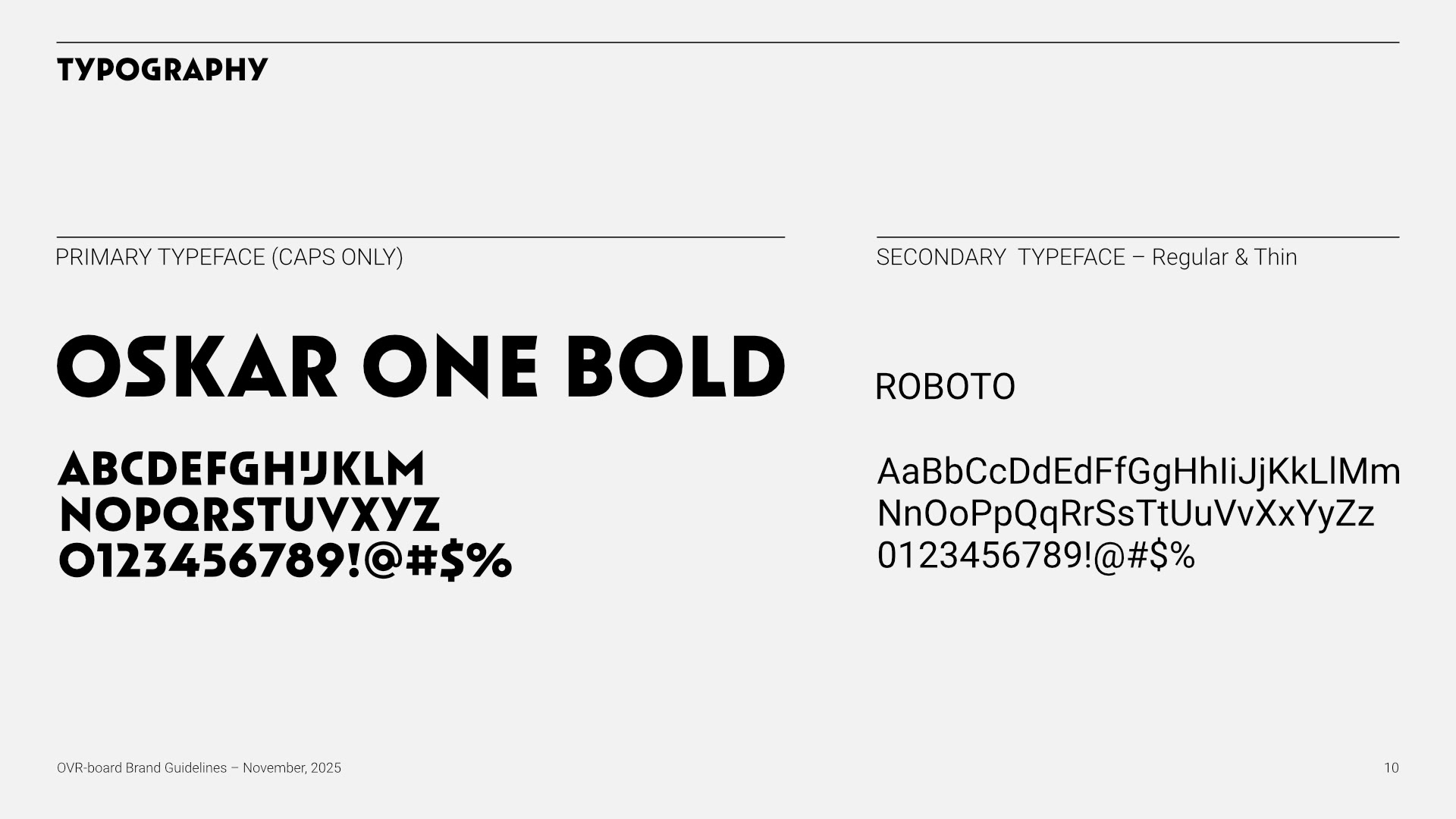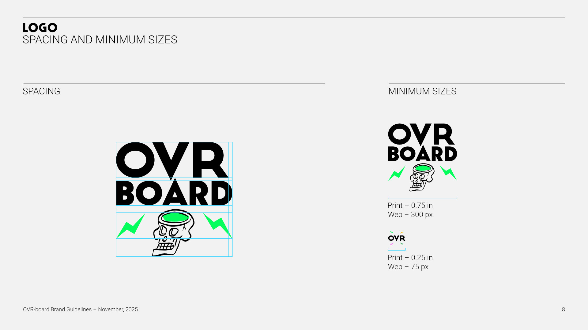 The final brand guidelines provide a strong strategic foundation for future growth, covering brand essence, personality, tone, and audience alignment. The system is adaptable across apparel, equipment, digital, and experiential touchpoints—positioning OVR-BOARD as a confident, design-driven brand ready to compete in the premium action-sports space.