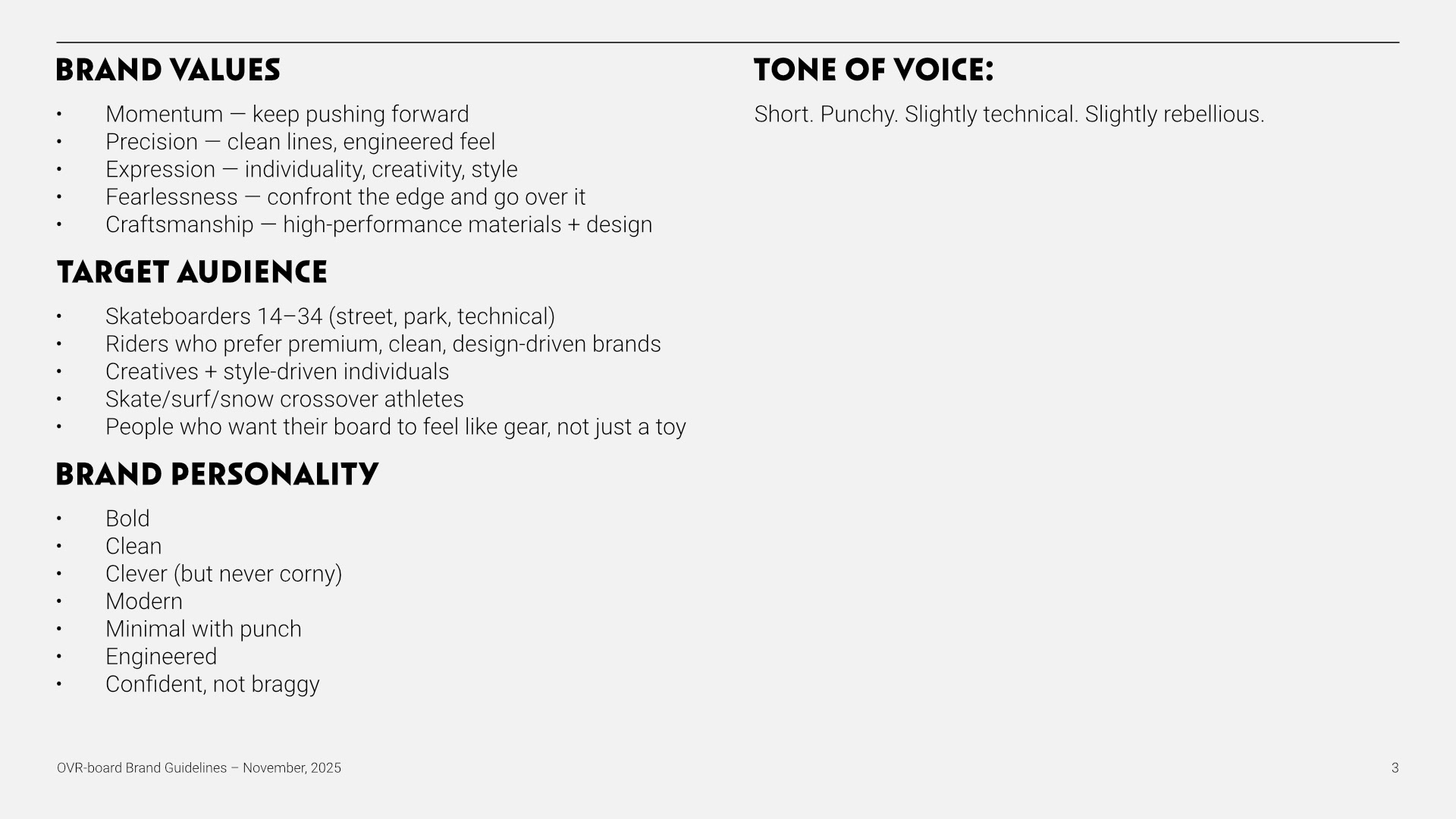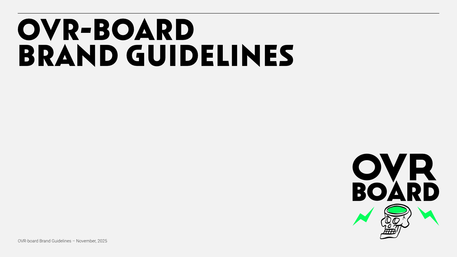 OVR-BOARD was conceived as a premium action-sports brand built for riders who push past fear, limits, and expectations. The goal of this project was to establish a clear, scalable brand framework—one that feels engineered, expressive, and confident across skate, surf, and snow culture. The guidelines define positioning, values, tone of voice, and audience to ensure consistency across product, marketing, and storytelling.